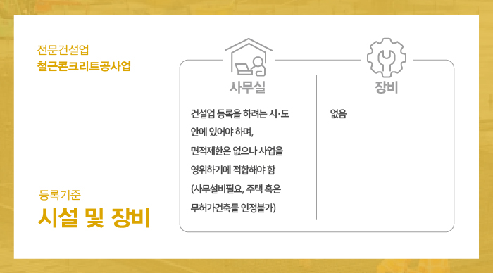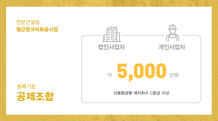 철근/콘크리트로 토목/건축구조물 및 공작물 등을 축조하는 공사인 철근콘크리트공사업은 전문건설업 중 하나의 공사업으로, 관계법령 건설산업기본법에 의거한 등록기준 요건인 자본금, 공제조합, 기술자, 사무실의 요건에 따라 회사의 제반사항이 충족되도록 준비하는 과정을 거쳐주셔야 면허 등록을 할 수 있게 됩니다.