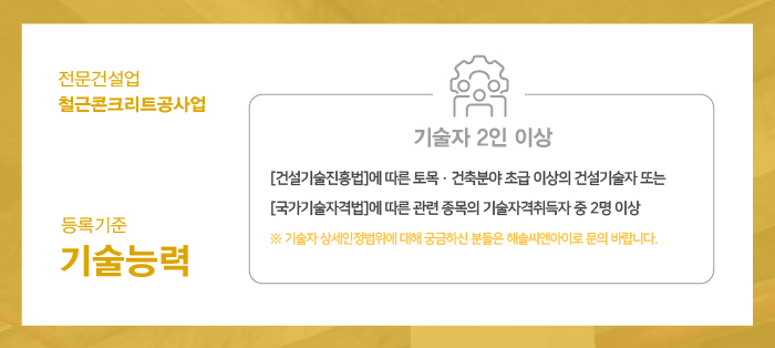 기술인력은 건설기술진흥법에 따른 토목, 건축 분야 초급 이상의 건설기술자 또는 국가기술자격법에 따른 관련 종목의 기술자격취득자로써 2명 이상을 구성해주셔야 합니다.