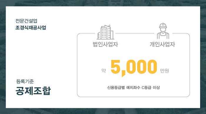 자본금은 건설사업 운영을 위한 목적을 가진 건설업 실질자본금의 형태로 법인사업자와 개인사업자 모두 1억 5천만원 이상을 갖추고 있어야 합니다.