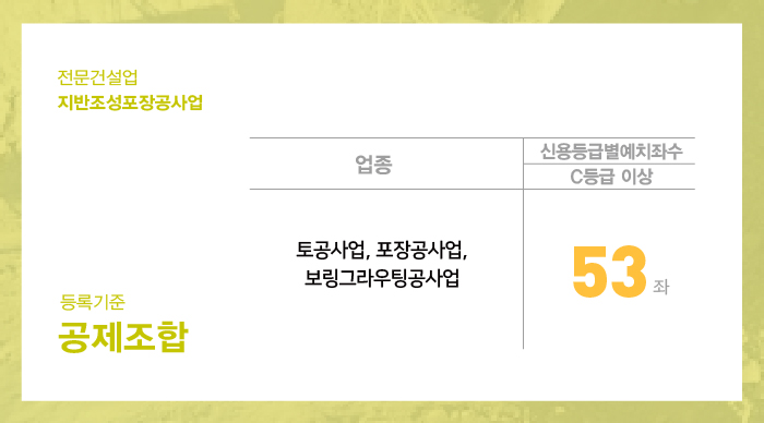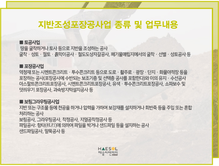 지반조성포장공사업은 토공사업, 포장공사업, 보링그라우팅공사업 세 가지의 주력분야를 가진 전문건설업종 중 하나의 공사업을 말합니다.