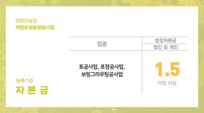 자본금은 건설사업 운영을 위한 목적을 가진 건설업 실질자본금의 형태로 법인사업자와 개인사업자 모두 1억 5천만원 이상을 준비할 수 있어야 합니다.