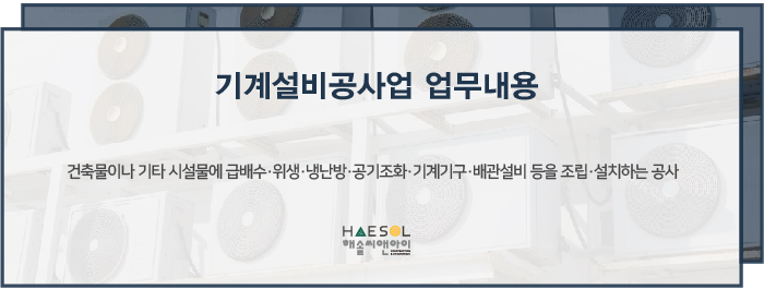 기계설비공사업은 전문건설업 중 하나인 기계설비가스공사업의 주력분야 중 하나로서, 건축물이나 기타 시설물에 급배수/위생/냉난방/공기조화/기계기구/배관설비 등을 조립/설치하는 공사를 하는 사업을 말합니다.