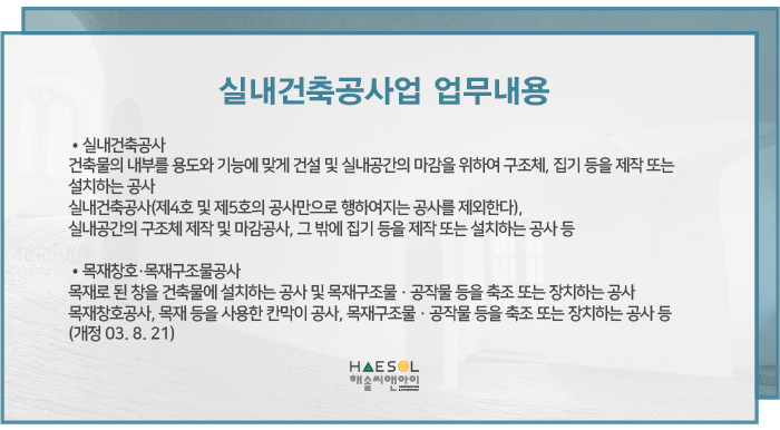 오늘은 실내건축면허 등록 준비과정에 대해 알아보았는데요, 더 자세한 안내나 도움을 원하시는 경우, 건설면허 전문가 해솔씨앤아이로 문의주시기 바랍니다.