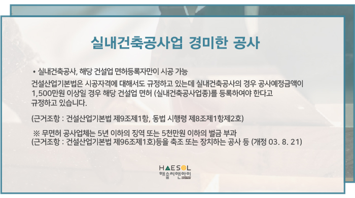 실내건축면허의 경우 실내건축공사업 운영을 하는데 있어 건당 공사예정금액 1,500만원 이상의 공사업무 영위를 하고자 하는 경우 반드시 면허 취득을 하도록 안내되고 있습니다.
