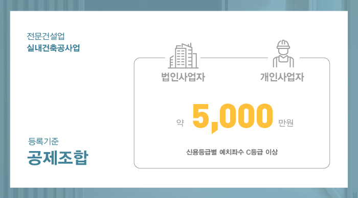 자본금의 경우 건설업 운영을 목적으로 하는 건설업 실질자본금의 형태로 법인사업자와 개인사업자 모두 1억 5천만원 이상을 갖추고 있어야 합니다.