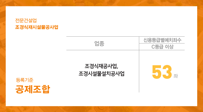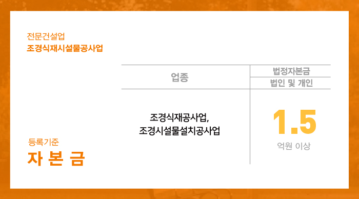 전문건설업 중 하나인 조경식재시설물공사업은 조경식재공사업과 조경시설물설치공사업을 주력 분야로 가지고 있습니다.