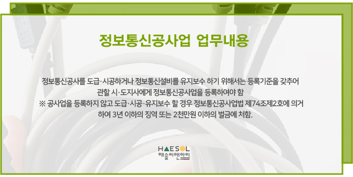 정보통신공사업은 정보통신공사의 도급 및 시공을 하거나 정보통신설비를 유지 및 보수하기 위해 반드시 면허 취득을 해야하는 사업으로써, 해당 업무의 무면허 시공 시 법적 처분을 받을 수 있다는 점을 유의해야 합니다.