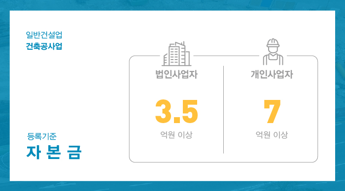 자본금은 건설사업 운영을 위한 목적을 가진 실질자본금으로써 법인사업자는 3억 5천만원 이상을, 개인사업자는 7억원 이상을 갖추고 있어야 합니다.