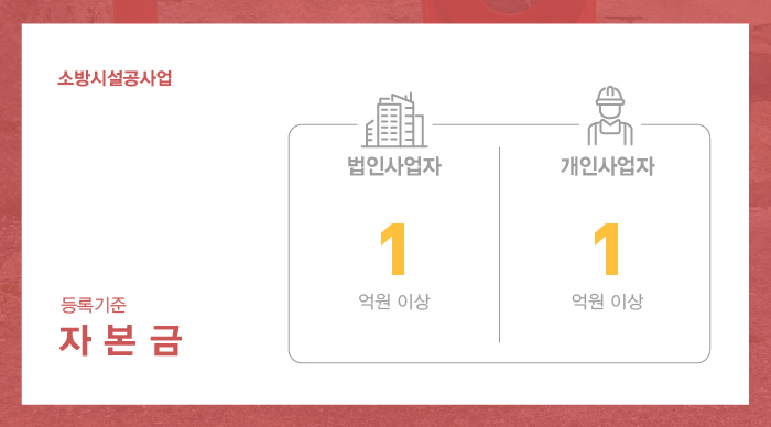 법인사업자와 개인사업자 모두 가져야 할 기준 자본금액은 1억원으로 동일하나, 법인사업자의 경우에는 실질자본금과 함께 법인등기부 등본 내 납입자본금 또한 등록기준 이상을 충족할 수 있어야 하며, 사업목적란에는 소방시설공사업에 관한 목적 기재가 이루어져 있어야 합니다.