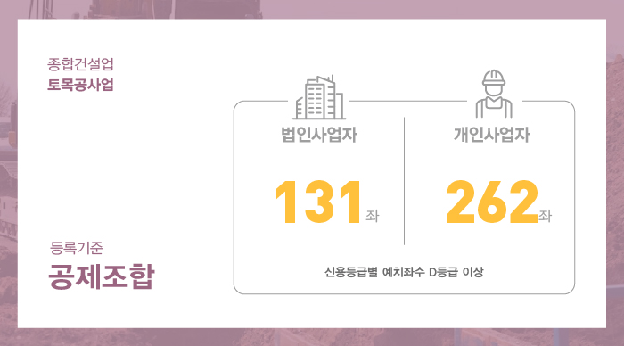 대부분의 경우 이를 건설공제조합을 통해 법인사업자는 131좌, 개인사업자는 262좌에 해당하는 금액을 출자금으로 예치한 뒤 보증가능금액확인서를 발급받는 것으로 준비하게 됩니다.