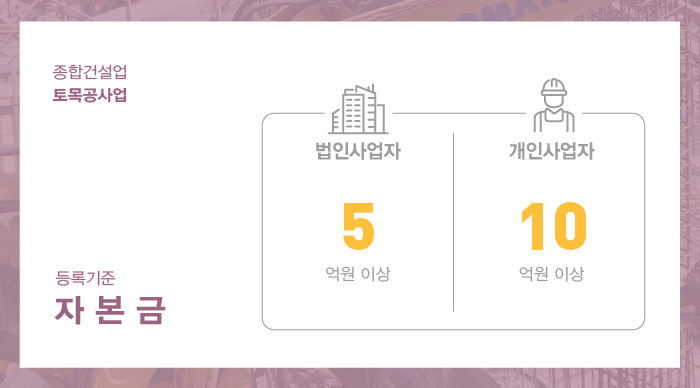 면허 등록을 위해 준비해야 하는 자본금의 경우 법인사업자는 5억원 이상, 개인사업자는 10억원 이상입니다.