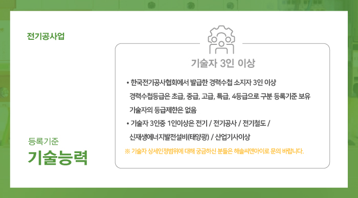 각 인력은 한국전기공사협회에서 발급하는 경력수첩을 보유한 자여야 하며, 경력수첩의 등급에는 별도 제한사항이 없으나 3인의 인력 중 최소 1인 이상은 전기, 전기철도, 전기공사, 신재생에너지발전설비(태양광) 분야의 산업기사 이상의 국가기술자격을 함께 보유하고 있어야 합니다.