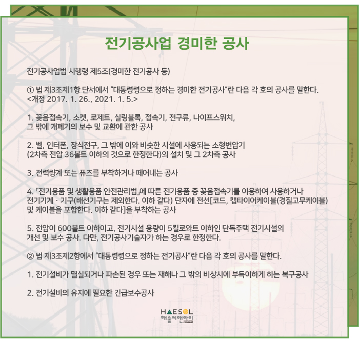 전기공사업의 경우, 위 안내 된 내용과 같이 경미한 전기공사 범위의 업무 이상의 공사업무를 수행하고자 할 경우 반드시 전기공사면허의 취득을 하도록 관계 법령에 규정되어 있습니다.
