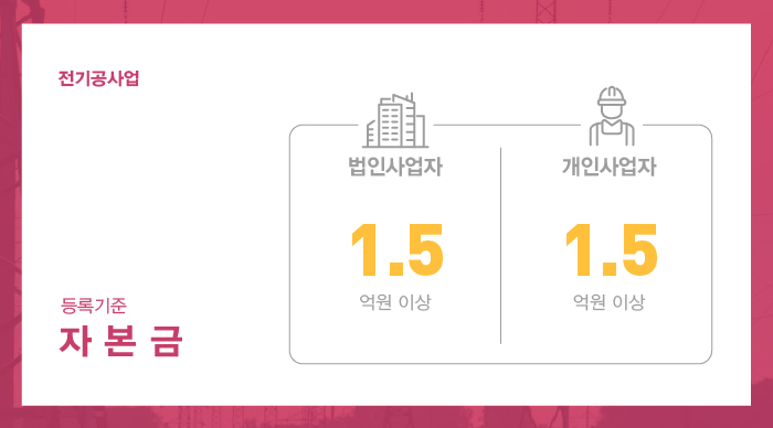 자본금은 법인과 개인사업자 모두 1억 5천만원 이상을 준비하여 주셔야 하는데요, 이 때 자본금은 전기공사 운영을 위한 목적을 가진 실질자본금의 형태로 준비되어야 하며, 법인사업자의 경우 실질자본금과 함께 법인등기부등본 내 납입자본금 역시 등록기준 이상을 갖추고 있어야 합니다.