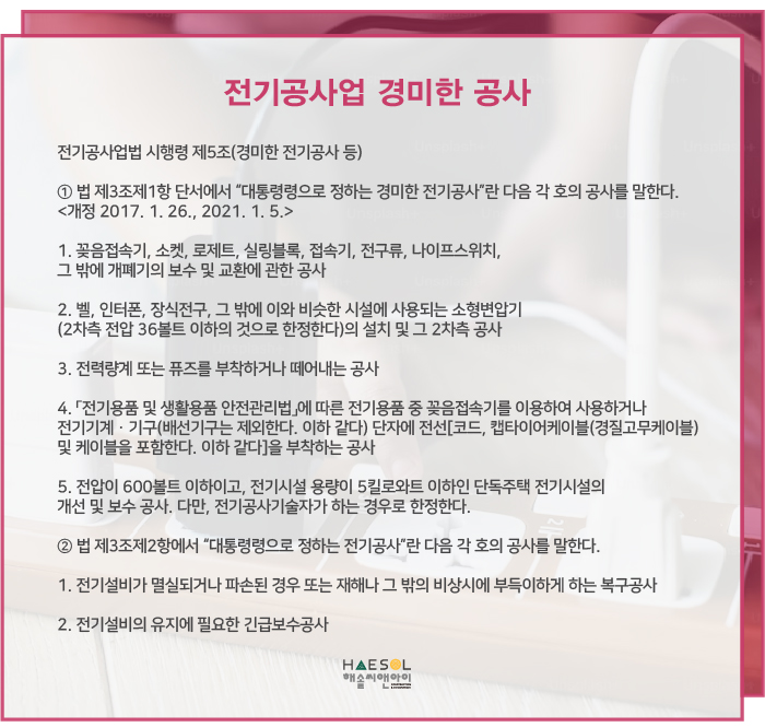 전기공사면허 등록과 관련하여 더 자세한 안내 및 도움을 원하시는 경우, 건설면허 전문가 해솔씨앤아이로 문의 주세요!