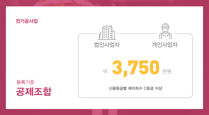 전기공사업 면허 등록을 위해 공제조합에 법인 및 개인 모두 약 3,750만원의 출자금 예치를 진행하신 이후 보증가능금액확인서를 발급 받아 면허 등록 접수 시 제출될 수 있도록 준비하셔야 합니다.