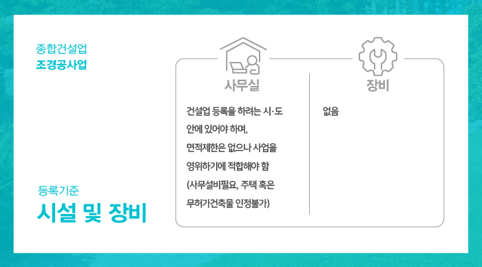 등록기준 요건들 중 하나라도 충족하지 못 한 경우에는 면허 등록이 절대 불가하기 때문에 조경공사업 면허 등록을 예정하시는 경우에는 다음 안내되는 등록기준 요건별 핵심 준비사항에 대해 꼼꼼한 체크 및 준비를 갖추시기 바랍니다.