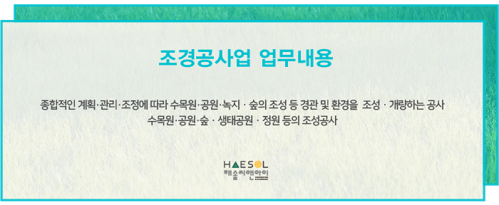 조경공사업은 종합건설면허 중 하나의 공사업으로써, 종합적인 계획과 관리, 조정에 따라 수목원, 공원, 녹지, 숲의 조성 등 경관 및 환경을 조성 및 개량하는 공사를 말합니다.