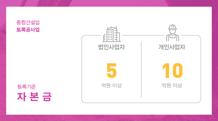 자본금은 법인사업자의 경우 5억원 이상, 개인사업자의 경우 10억원 이상이 준비되어야 합니다.