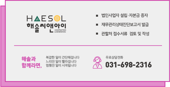 면허 등록을 위한 법인사업자 설립부터 자본금 증자, 기업진단보고서 발급과 관할처 접수서류 검토 및 작성에 이르는 전 과정에 대해 궁금한 점이 있으시다면, 건설면허 전문가 해솔씨앤아이로 문의주시기 바랍니다.