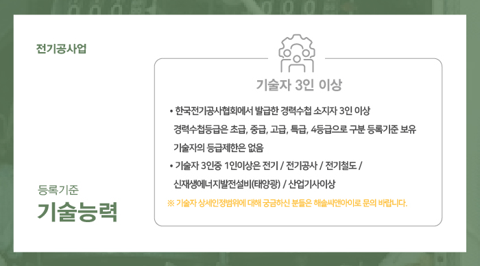기술자의 경우 총 3인 이상이 준비되어야 하는데요, 각 인력을 한국전기공사협회에서 발급하는 경력수첩을 소지한 분들이어야 합니다.