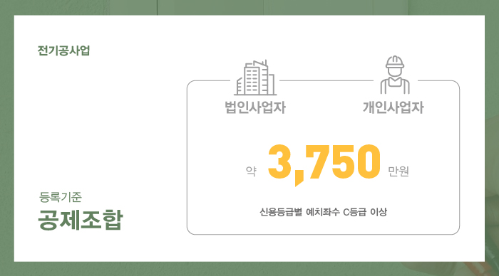공제조합은 사업 운영 시 필요한 각종 보증업무를 처리하는 곳으로, 전기공사면허등록을 위해서는 전기공사공제조합을 통해 약 3,750만원 가량의 금액을 예치하는 과정을 거쳐주게 됩니다.
