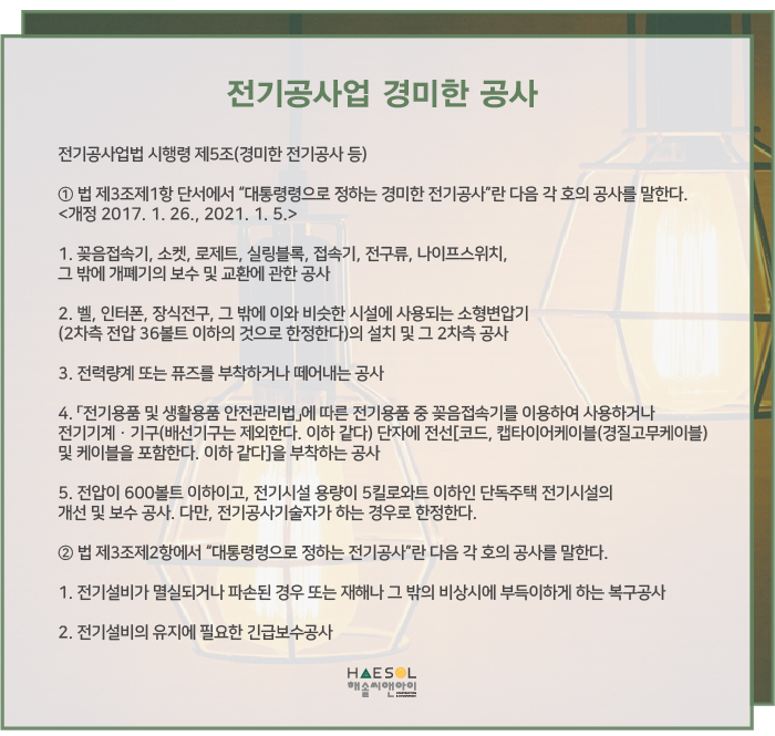 전기공사면허는 전기공사 관련 업무 운영 시, 상기 안내되는 경미한 전기공사 이상의 공사업무 영위를 하고자 할 경우 반드시 취득하도록 관계법령에 안내되고 있는데요, 사실상 많은 공사가 경미한 전기공사 이상의 범위를 요구하기 때문에 원활한 사업 운영을 하기 위해선 면허 취득을 우선하시는 것이 유리합니다.