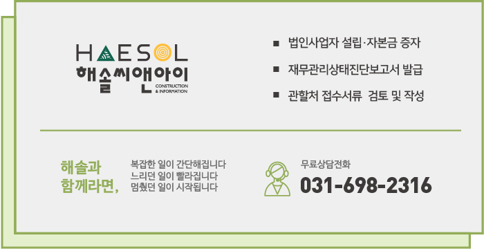 자본금 준비 이후에는 재무제표를 분석하여 건설업 실질자본금 보유 유무를 판단하는 기업진단을 진행, 자본금 보유 적격판정을 받은 기업진단보고서의 준비를 진행해야 합니다.