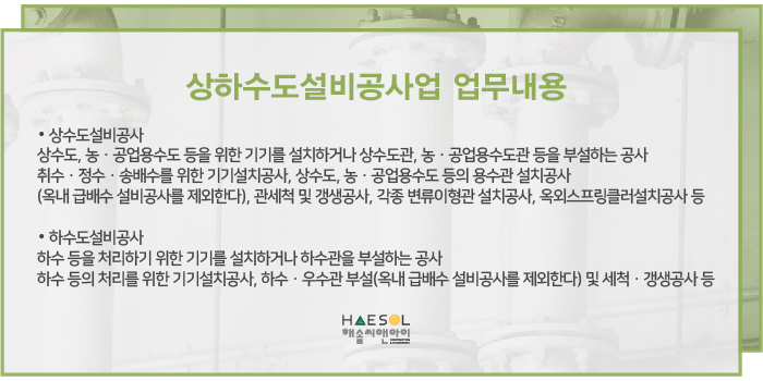 상하수도설비공사업은 업명 그대로 상수도설비공사 및 하수도설비공사를 하는 전문건설업 중 하나의 공사업을 이야기 합니다.