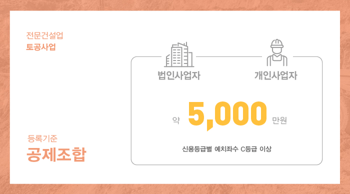 법인과 개인사업자 모두 전문건설공제조합을 통해 약 5,000만원의 출자금 예치가 필요합니다.