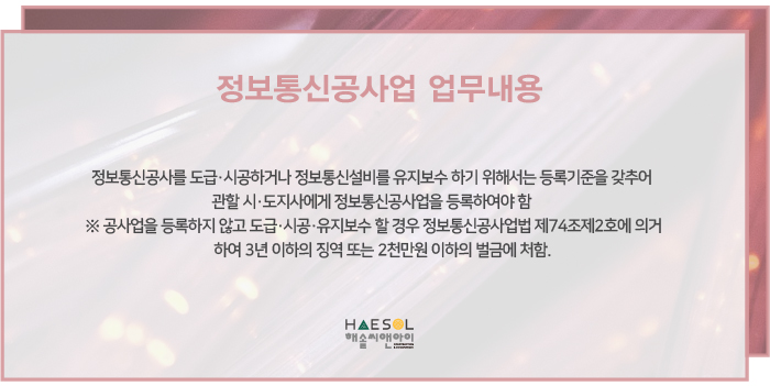정보통신공사업 면허 등록과 관련한 더 자세한 안내나 도움을 원하시는 경우, 건설면허 전문가 해솔씨앤아이로 문의주시기 바랍니다.