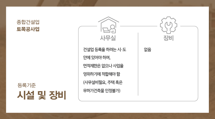 면허 등록을 위해서는 자본금, 공제조합, 기술자, 사무실과 같이 관련 법령에서 정하는 등록기준 요건을 충족하도록 회사의 제반사항이 꾸려져 있어야 합니다.