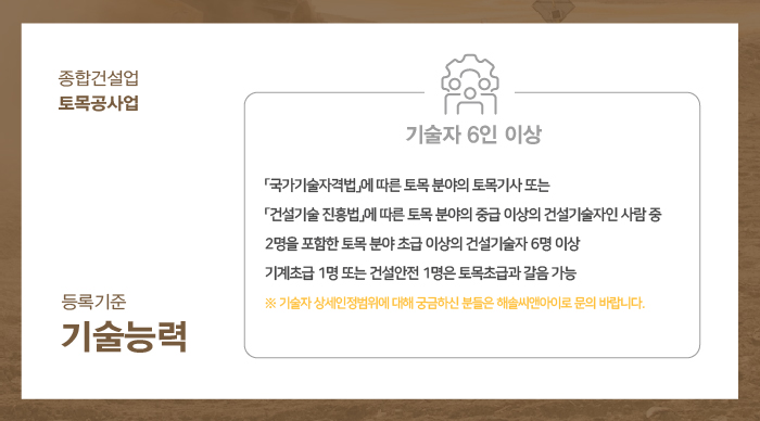 기술인력은 총 6인 이상이 갖춰져야 하는데요, 해당 인력의 자격요건은 위 이미지를 참고하여 주시기 바랍니다.