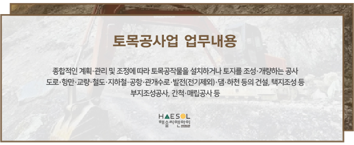 토목공사업은 토목공작물의 설치 및 토지의 조성/개량 공사를 수행하는 종합건설업종 중 하나로써 건당 공사예정금액 5,000만원 이상의 공사를 진행하기 위해 반드시 면허 취득을 진행해주셔야만합니다.