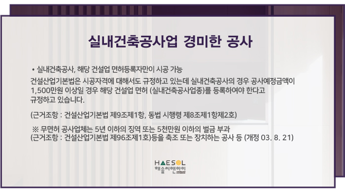실내건축공사업 면허의 경우 건당 공사예정금액 1,500만원 미만과 같은 경미한 공사업무의 경우 무면허시공도 가능하지만, 그 이상의 공사업무 영위를 하고자 하는 경우 반드시 면허 취득을 하도록 건설산업기본법에 안내되고 있습니다.
