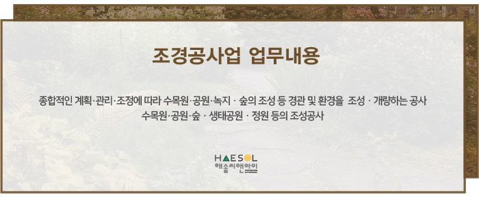 조경공사업은 종합적인 계획/관리/조정에 따라 수목원/공원/녹지/숲의조성 등 경관 및 환경을 조성/개량하는 공사를 하는 것을 말합니다.